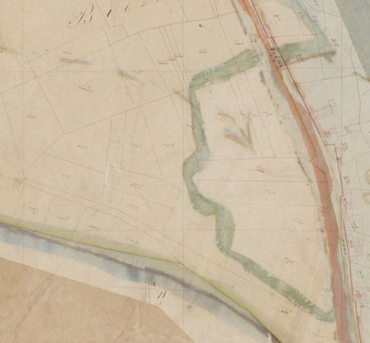 van 1832 geprojecteerd. De percelen binnen de grenzen van de